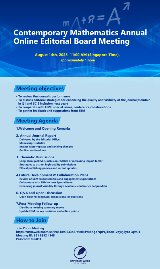 Contemporary Mathematics(CM) has just received its 2024 Impact Factor of 2.5, placing it firmly in Q1, holding great potential for inclusion in SCIE in the near future. This meeting will be a valuable opportunity to update our EBMs on journal recent developments and achievements, as well as to gather insightful feedback for future growth.